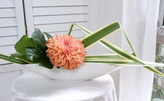 今月のDAFAコースの創作は、各級で葉物使いをレッスン。折るのか曲げるのか丸めるのか、選んだ花器のキャラクターに見合った用い方からデザインは始まります。クラシックと違い、創作のモダンスタイルは生徒さん達が楽しそうにアレンジしています。細かいところが気になりますが、余計な口をはさまずのびのびやっていただきました。